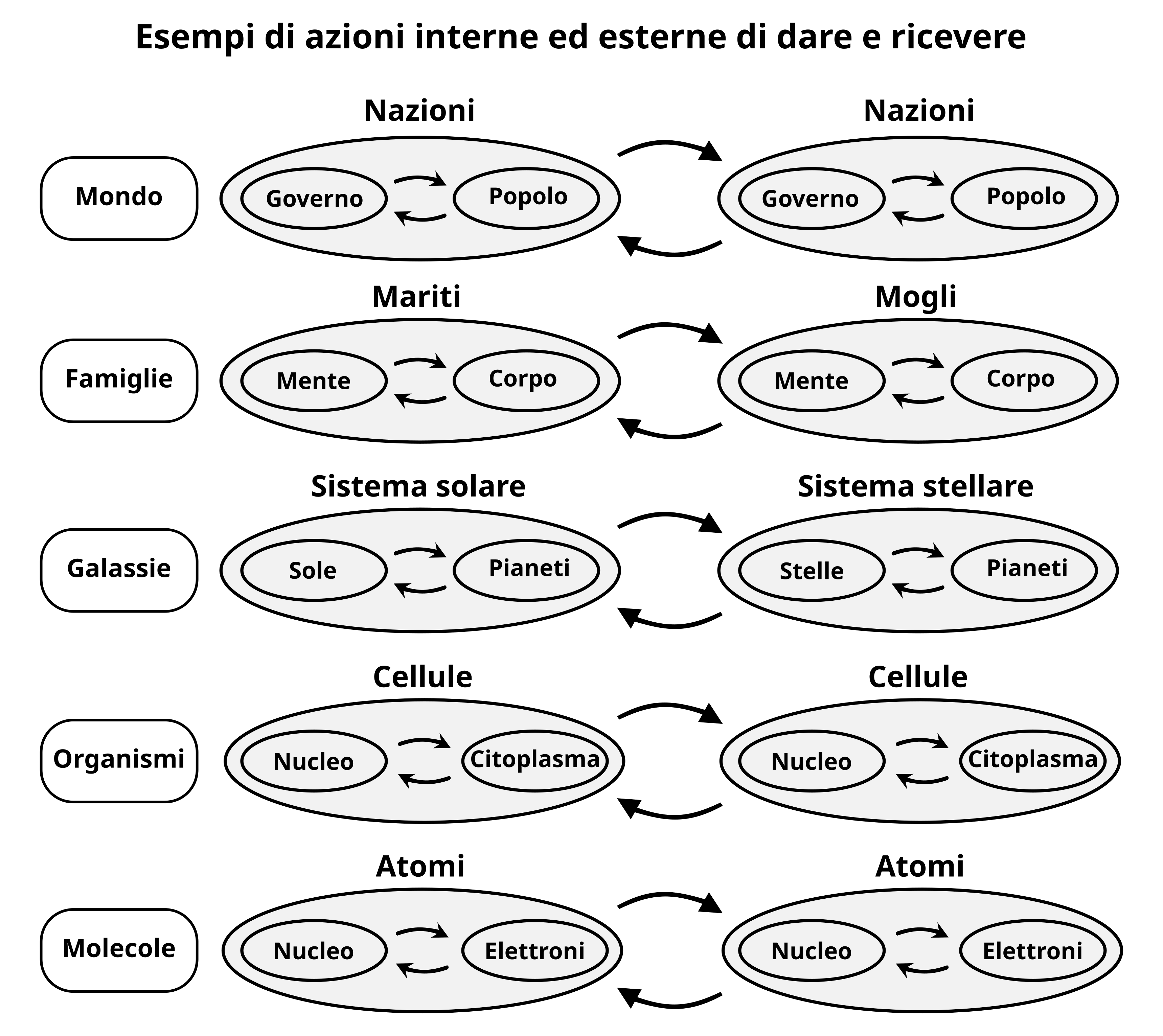 In natura esiste una innumerevole varietà di interazioni e relazioni reciproche. Alcune sono totalmente inconsce, eteronome o automatiche, come le interazioni di forze che avvengono nel mondo fisico; altre sono semi consce, istintive o parzialmente autonome, come quelle che avvengono nei diversi livelli degli organismi viventi; altre sono coscienti, volontarie e creative come le relazioni umane. Nonostante questa varietà, tutte rispondono allo stesso modello, schema o principio comune.