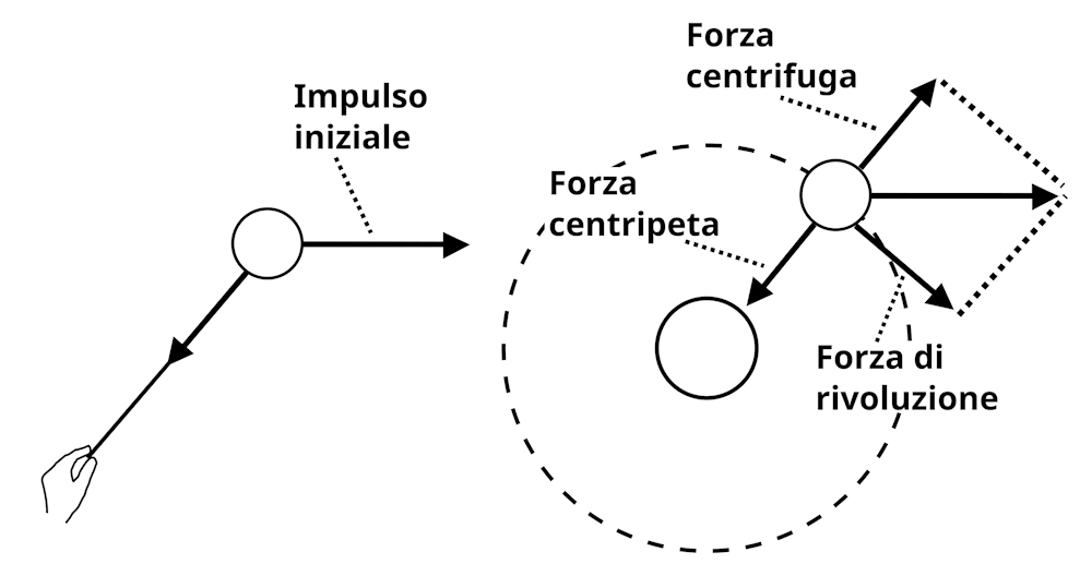 Quando Newton cercò di spiegare il fatto che i pianeti girano intorno al sole, suppose che ci dovesse essere stato un impulso iniziale. La stessa cosa che accade quando si lancia una palla legata ad una corda che si tiene con la mano.